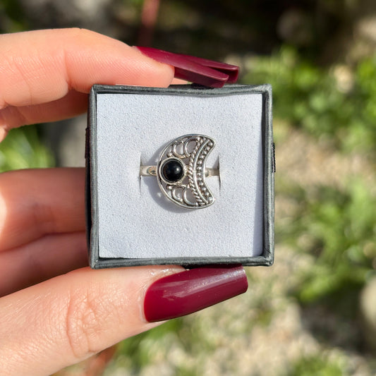 Black Onyx 925 Silver Moon Ring (SIZE S) - Dark Femme Collection