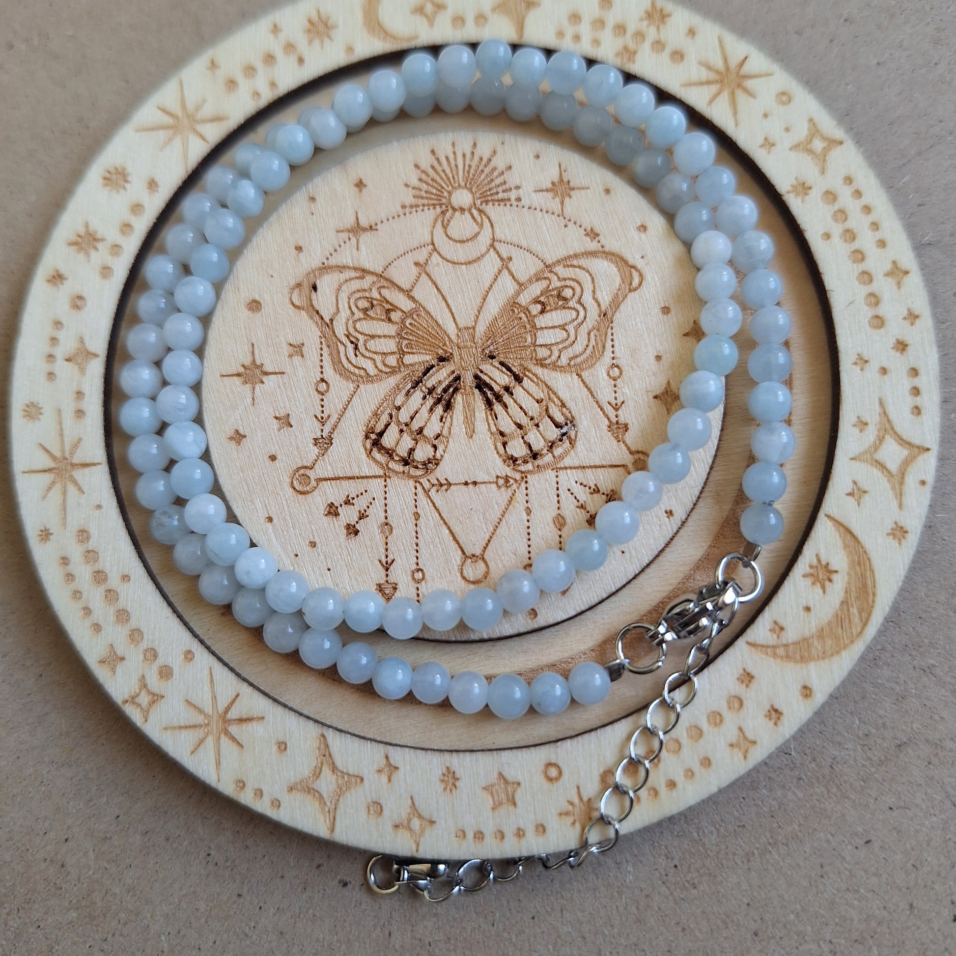 Expertly handcrafted with calming Aquamarine 4mm beads, this adjustable choker necklace exudes witchy vibes. Perfect for daily wear or special occasions, the 15-17" length provides a comfortable fit. Communicate your love for all things mystical and stylish with this unique piece.