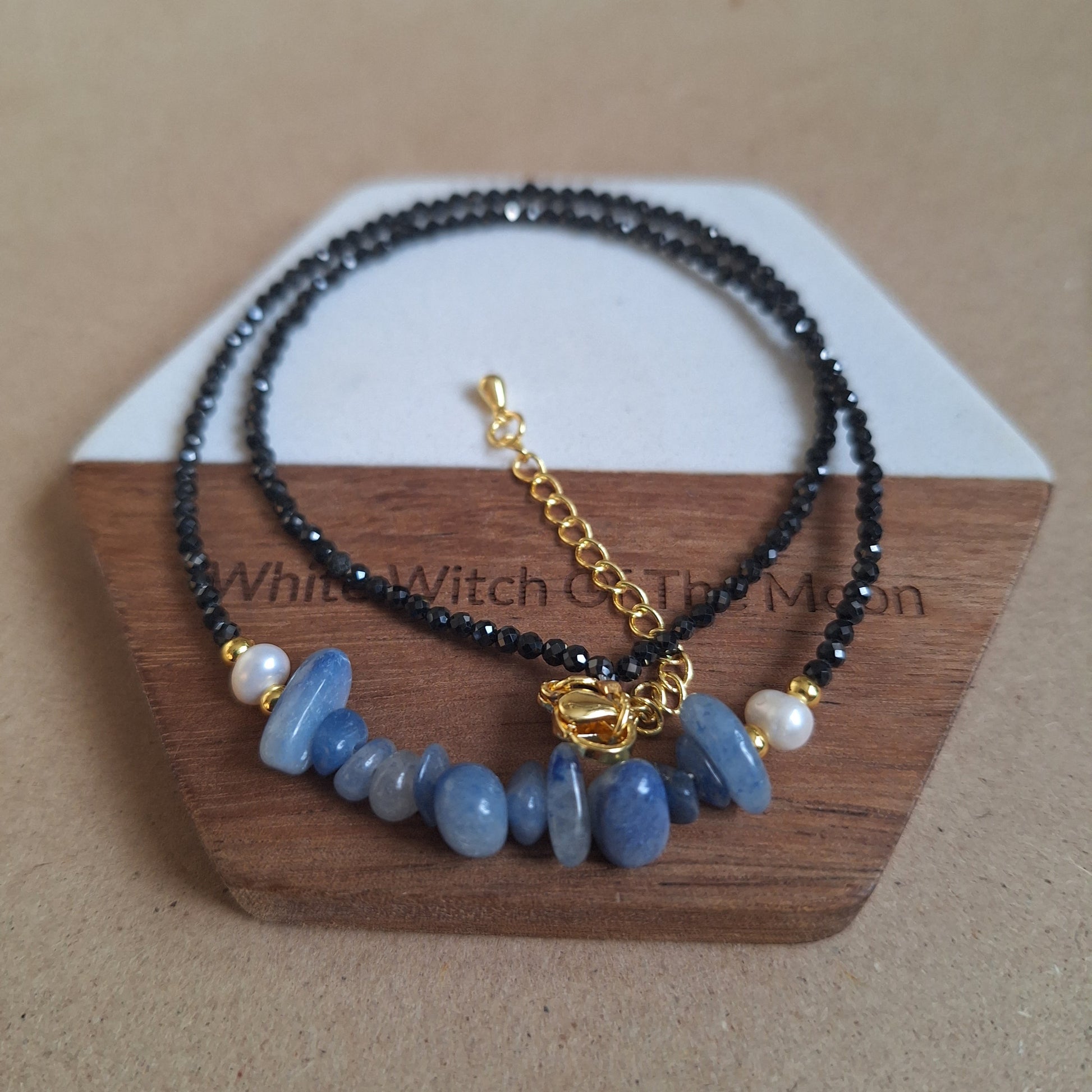 Black tourmaline minimalist beaded choker with Blue Aventurine chips and pearl bead detailing. Choose from gold or silver.