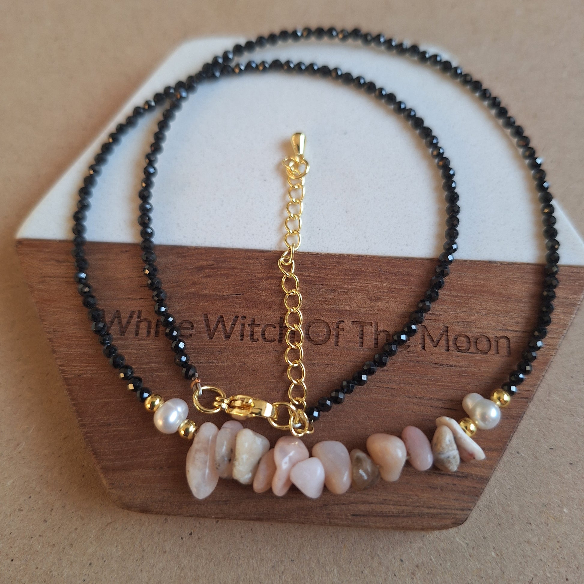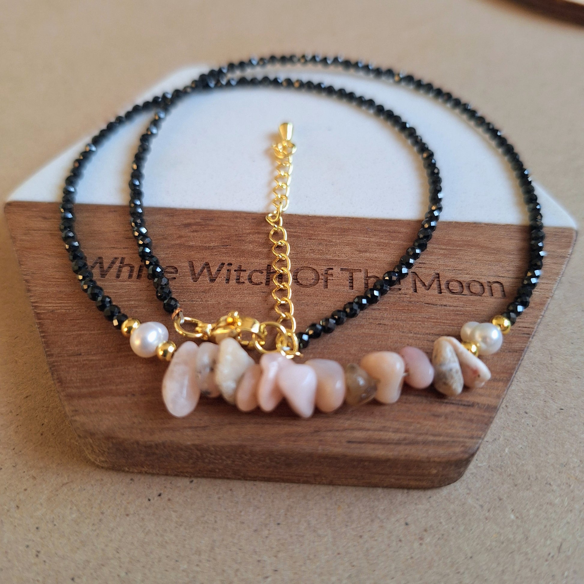 Black tourmaline 3mm bead choker with pink Opal chips and pearl bead detailing. Choose from gold or silver.