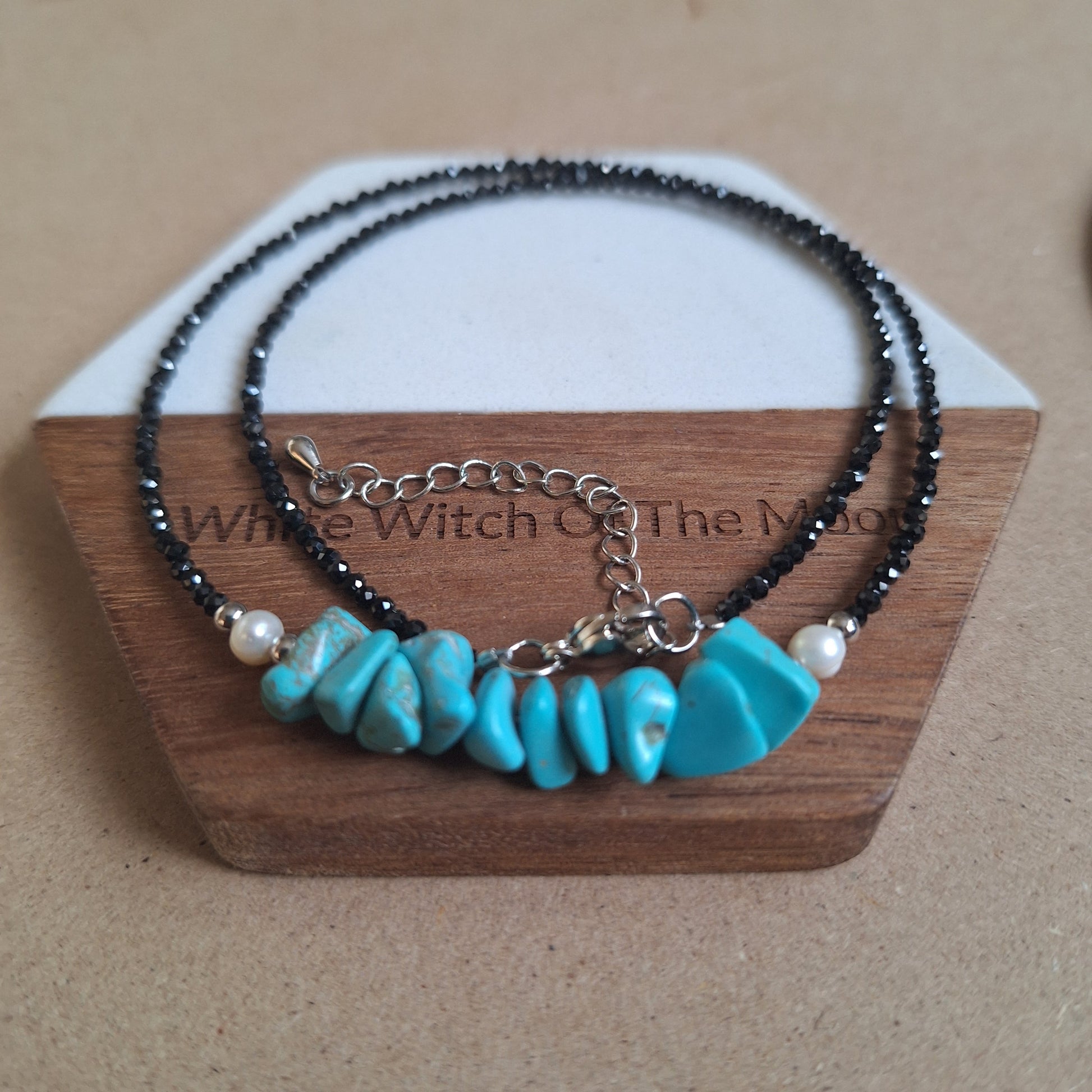 Black tourmaline 2mm bead choker with turquoise howlite chips and pearl bead detailing. Choose from gold or silver.
