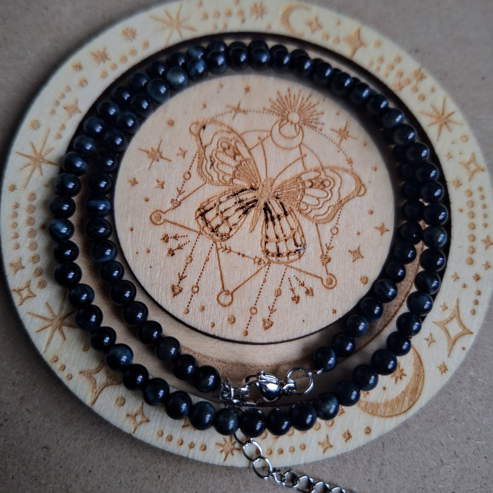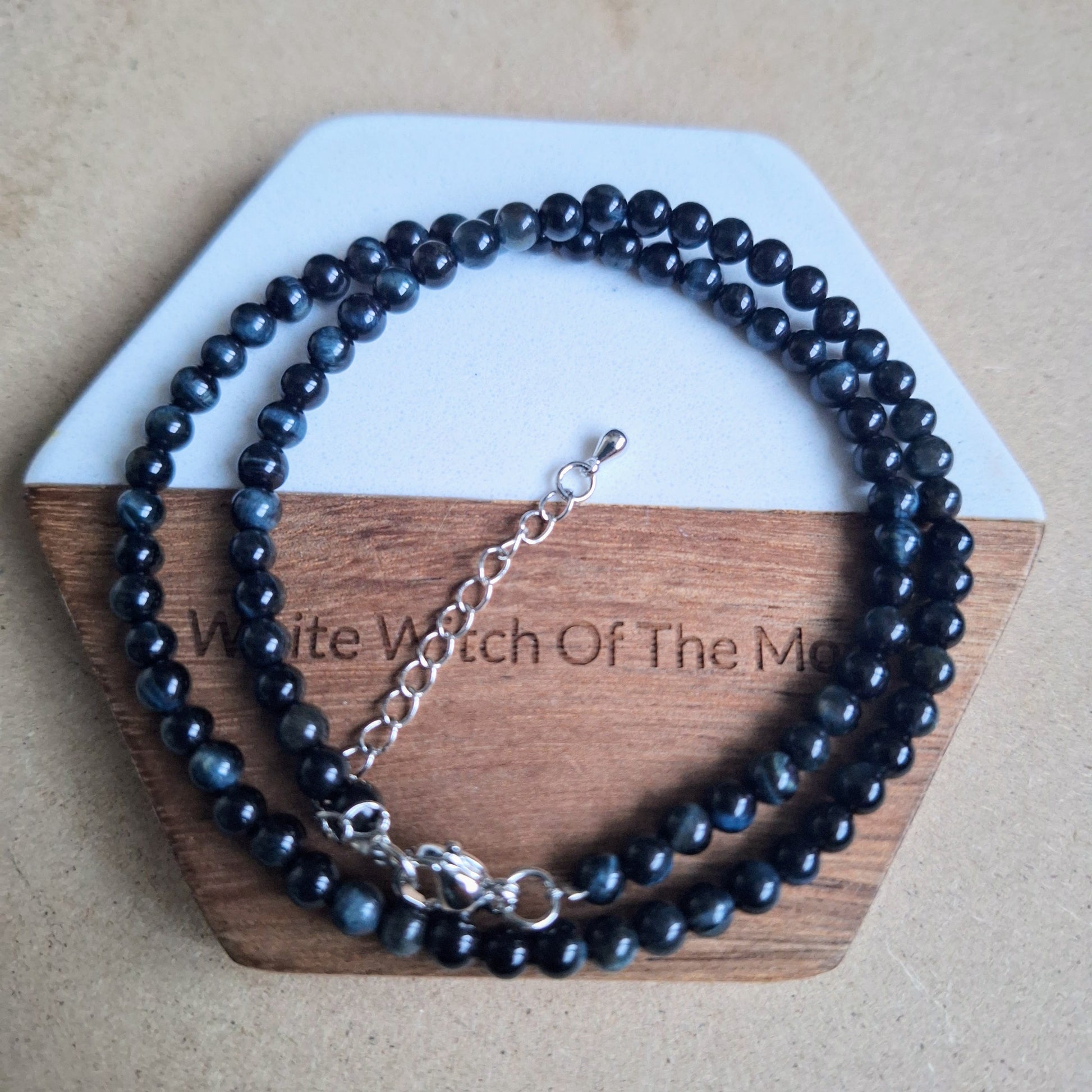 Enhance your style with our Blue Tigers Eye 4mm bead choker. This 15-17" adjustable necklace offers the powerful qualities of communication, protection, and courage, all while giving off mesmerizing witchy vibes. Perfect for any outfit or occasion.