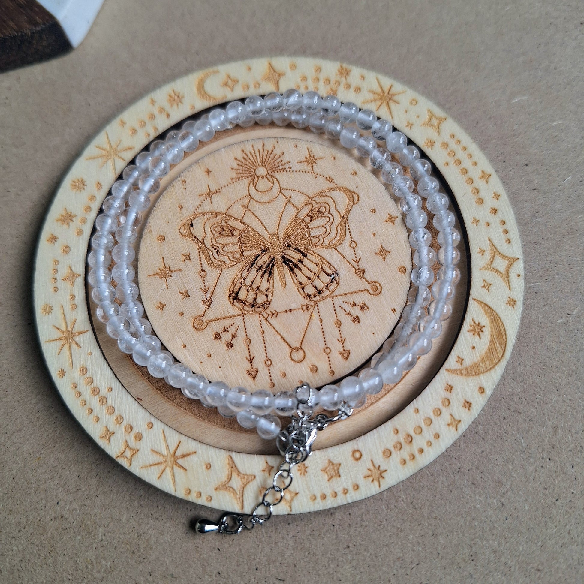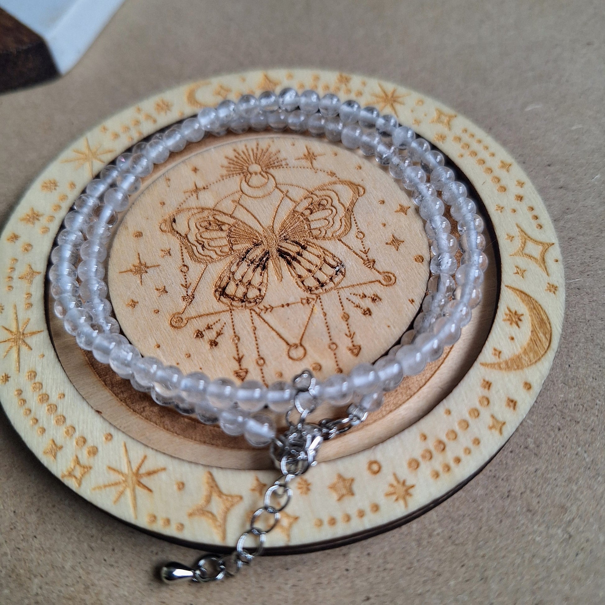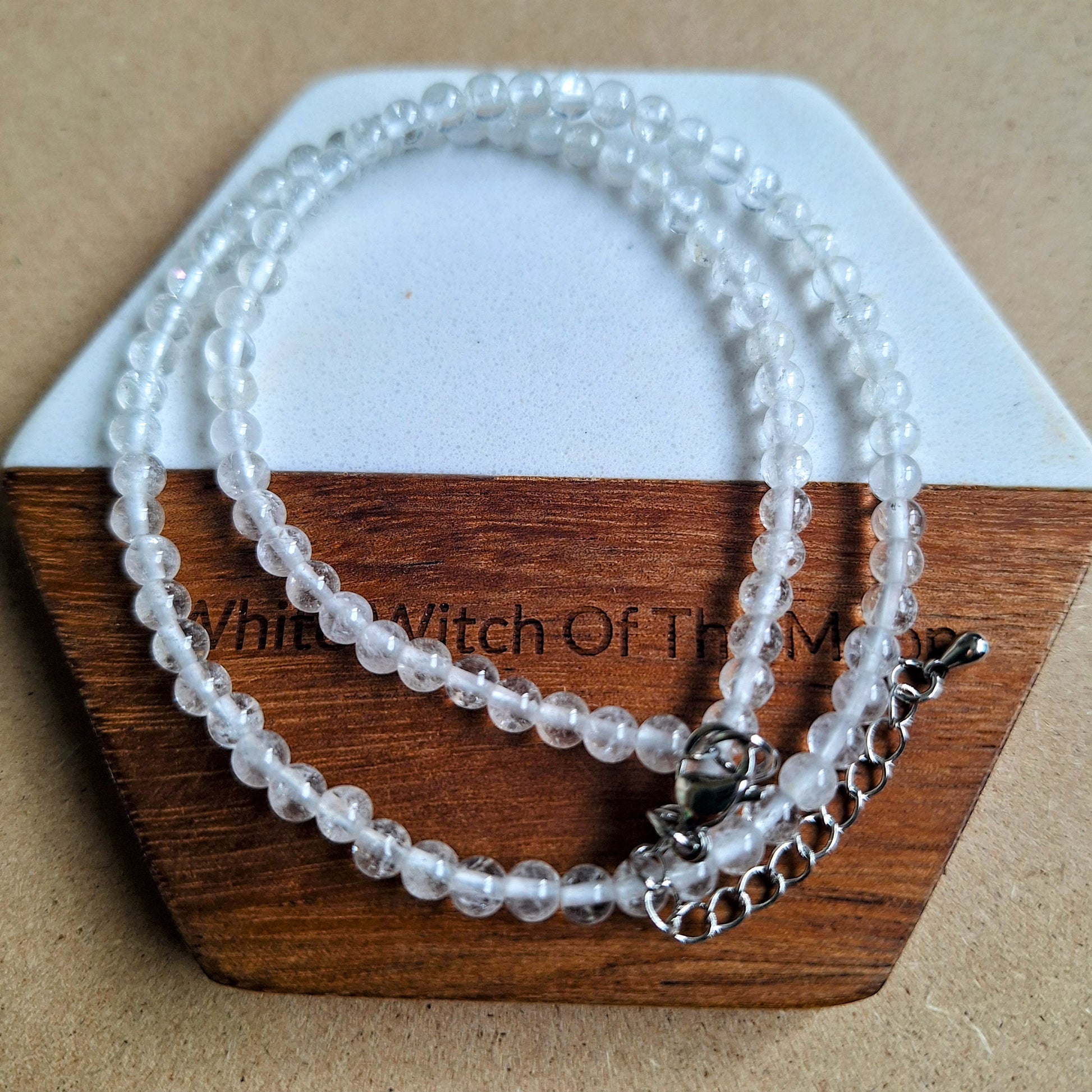 This Clear Quartz choker features 4mm beads and is 15-17" long. As a master healer, Clear Quartz is believed to amplify energy and aid in spiritual clarity. Add this elegant and versatile piece to your collection for its potential benefits and stylish design.