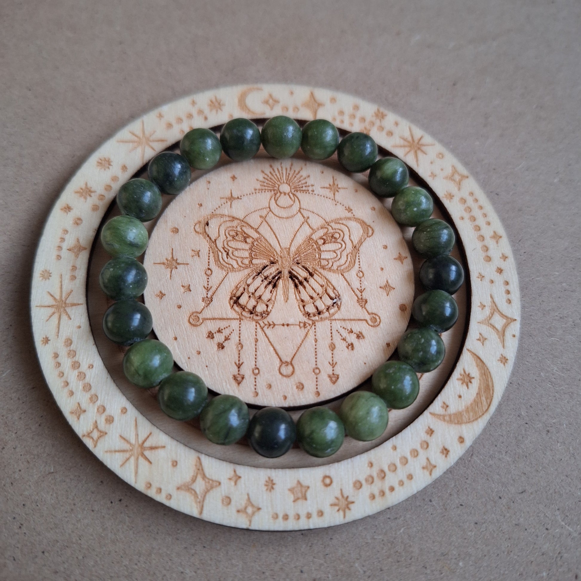 This genuine 8mm green jade bracelet is designed to bring luck, love, and abundance to its wearer. Made from 100% natural jade, this bracelet boasts a unique, smooth finish and is believed to have healing properties. Enhance your well-being and style with this jade bracelet.