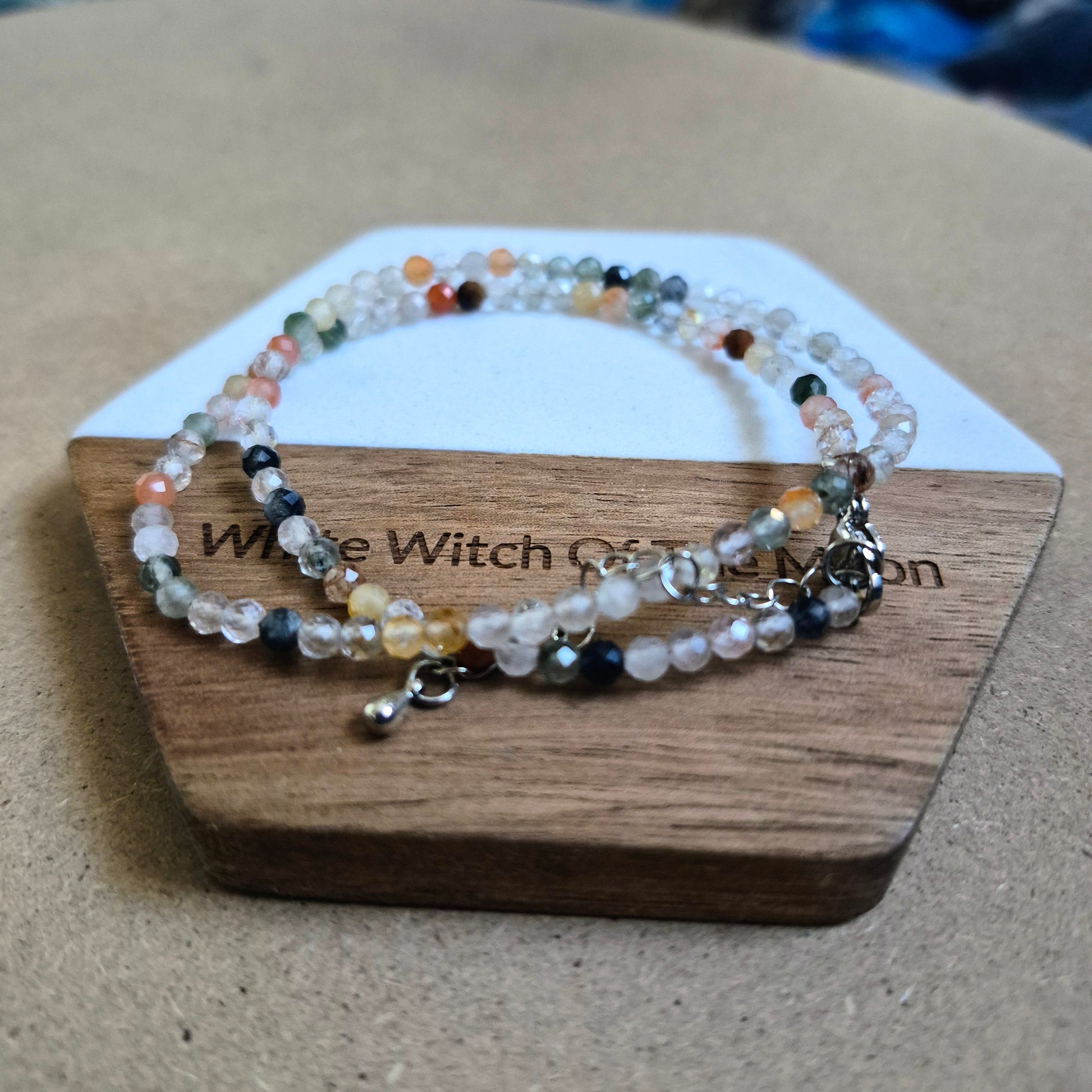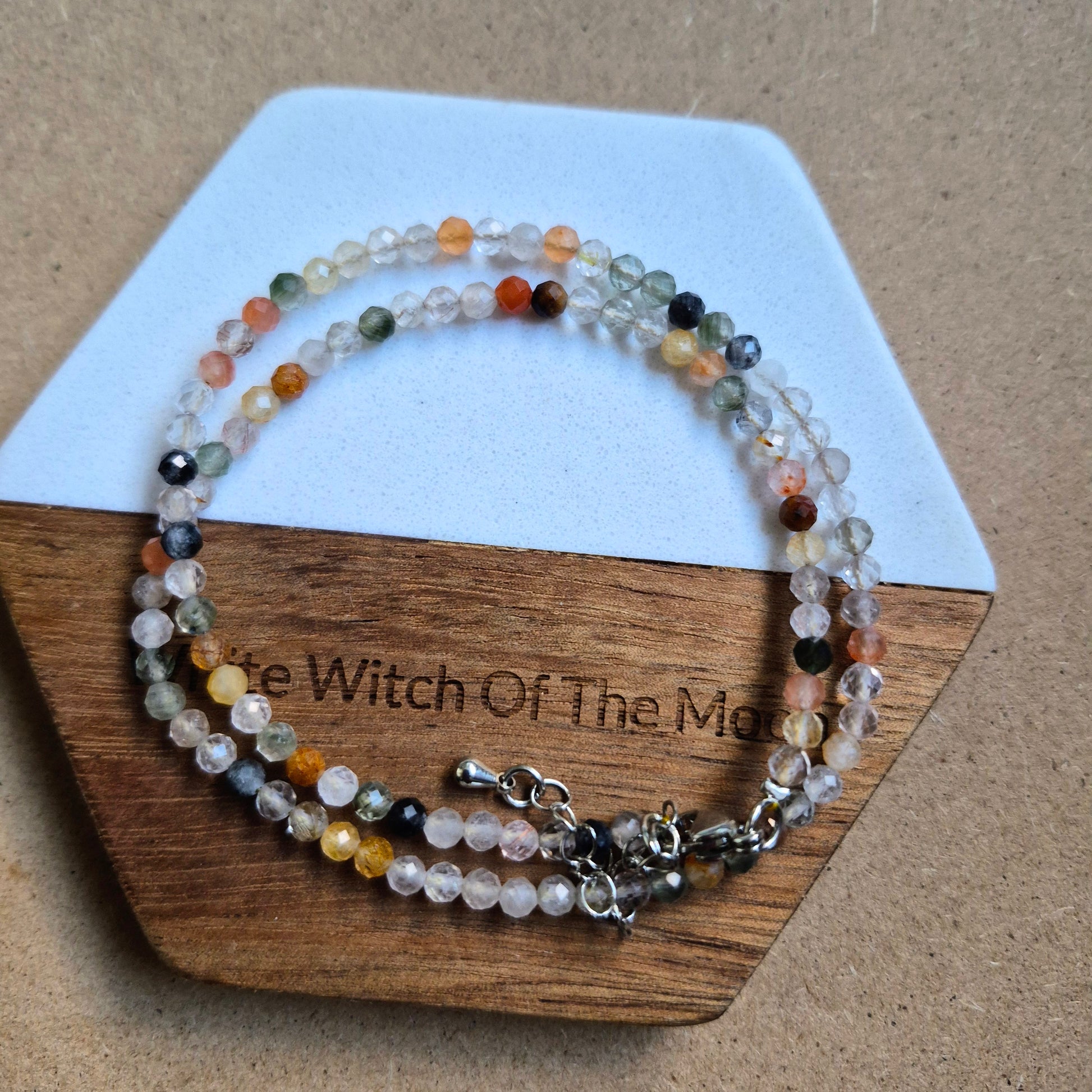 This mixed rutile quartz choker features 3mm faceted beads, known for their healing and protective properties. Manifest your intentions with this versatile choker, perfect for everyday wear. Expertly crafted and designed to bring balance and positive energy to your life.