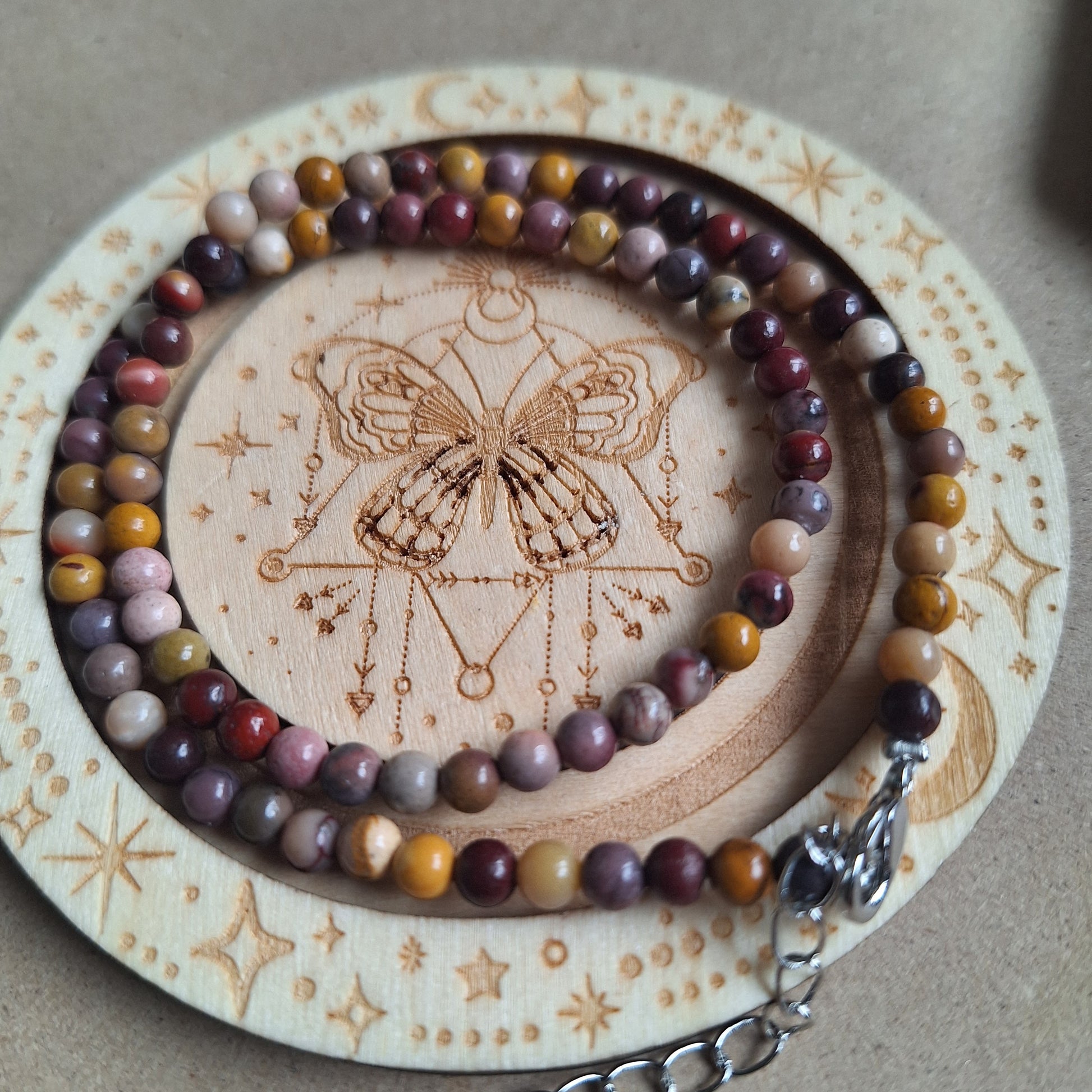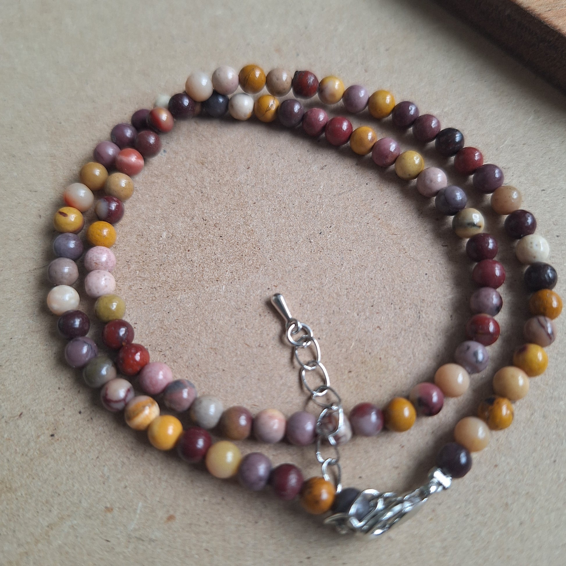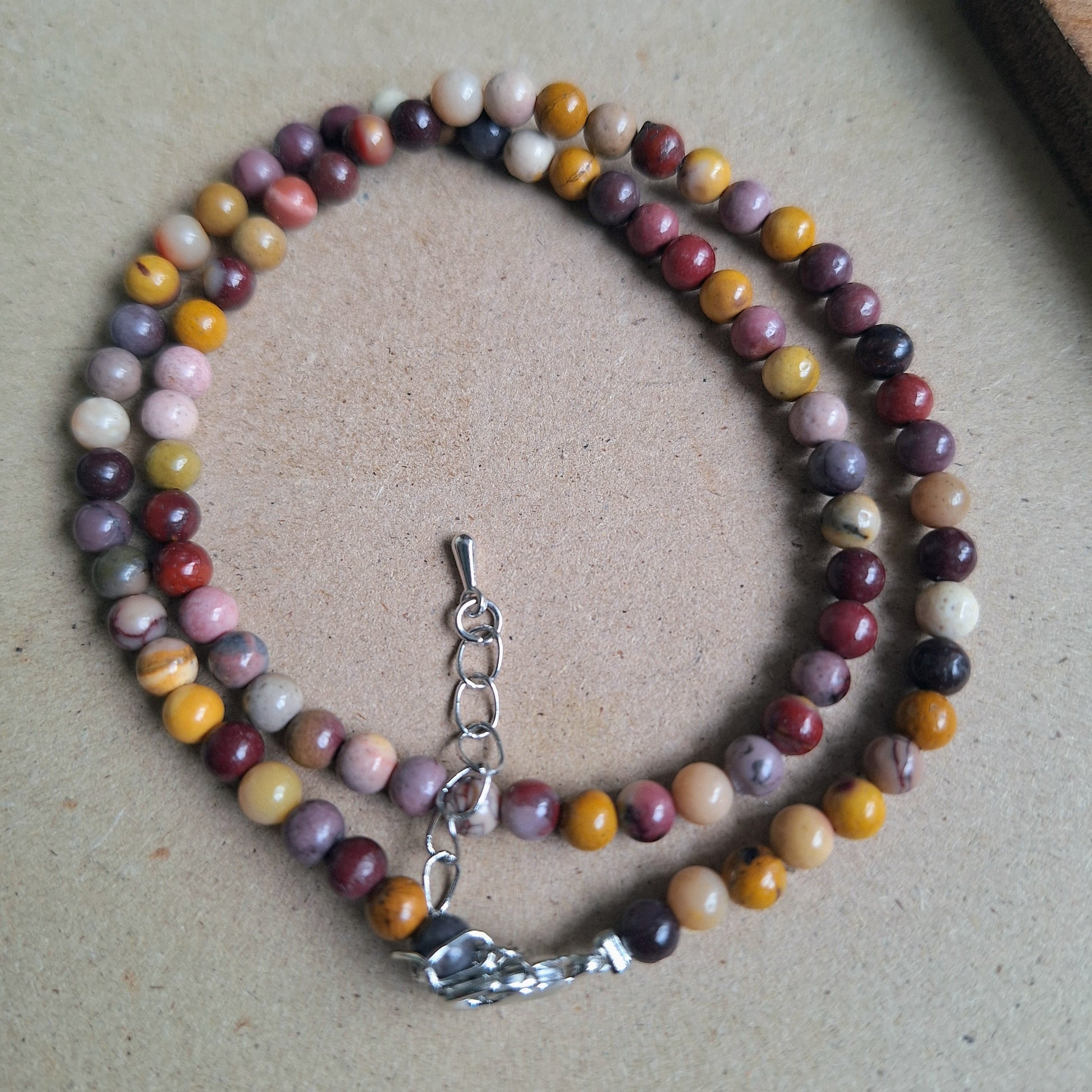 Experience a sense of grounding with our Mookaite choker. This choker features 4mm round beads made of Mookaite, a gemstone that promotes balance and stability. Adjustable between 15-17 inches in length, it offers flexibility and versatile styling options. Elevate your everyday look with this unique and grounding piece.