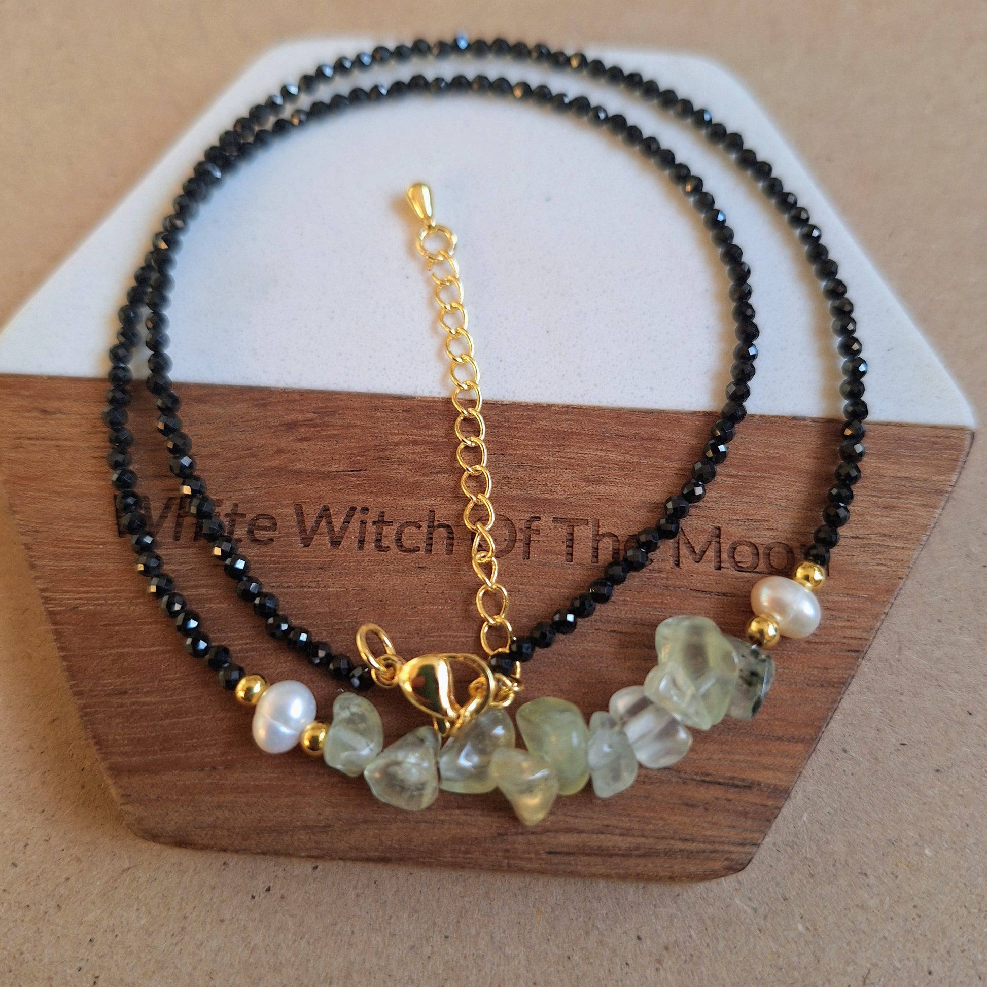 Black tourmaline 3mm bead choker with prehnite chips and pearl bead detailing. Choose from gold or silver.