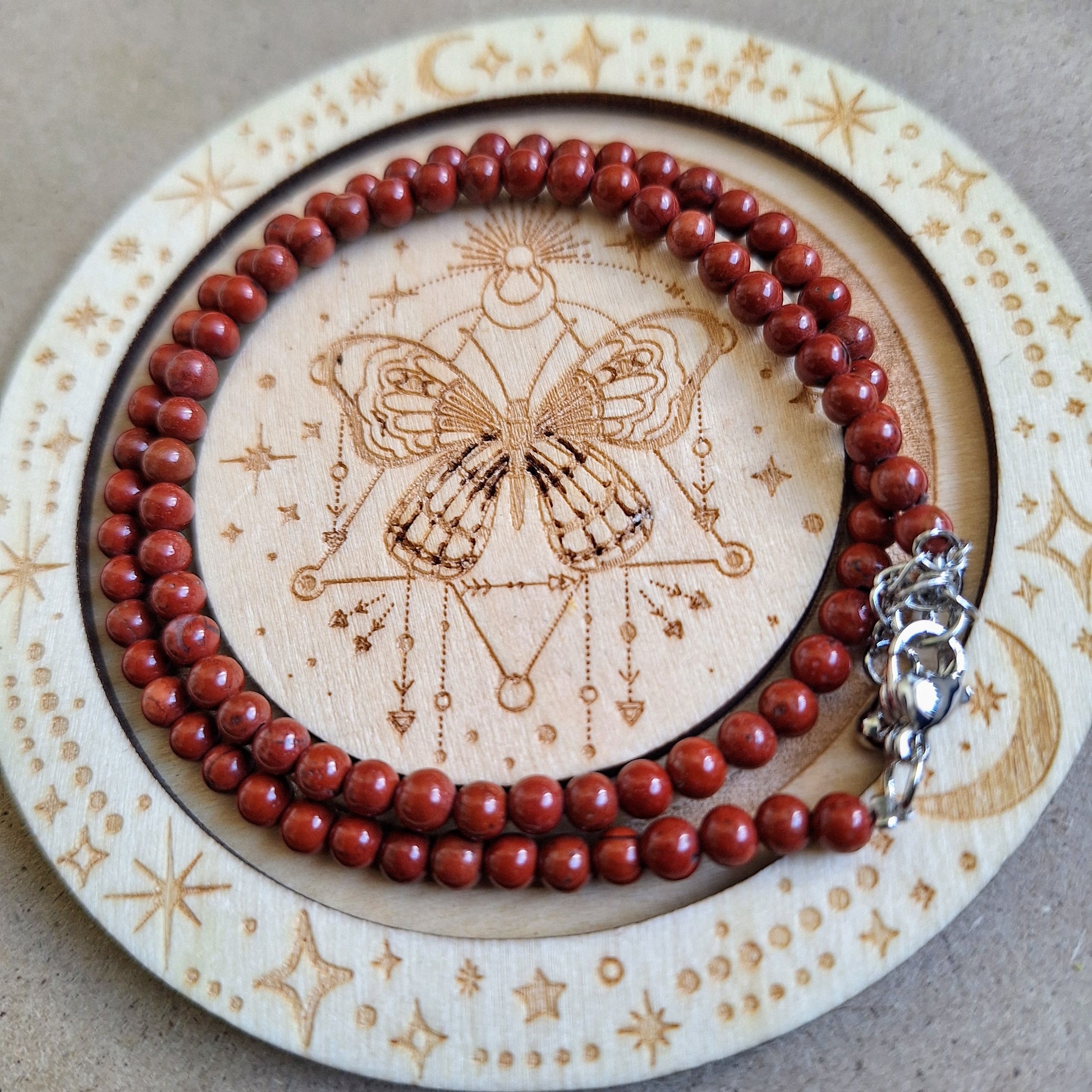 Discover the grounding strength and courage of our Red Jasper choker necklace. This expertly crafted piece features 3mm round beads for a polished look. At a length of 15-17 inches, this necklace is perfect for adding a touch of boldness to any outfit.